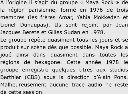 Al’origineils’agitdugroupe« MayaRock»delarégionparisienne,forméen1976detrois membres(lesfrèresAmar,YahiaMokkedenetLionelDuhaupas).IlssontrejointparJean Jacques Berete et Gilles Sudan en 1978.Legrouperépètequasimenttouslesjoursetseproduitsurscènedèsquepossible.MayaRock ajouéainsidansquasimentdanstouteslesrégionsdehexagone.Cetteannée1978legroupe enregistrequelquestitresauxstudiosBerthier(CBS)sousladirectiond’AlainPons. Malheureusement aucune trace audio ne reste de cette session.