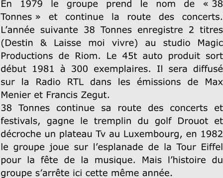 En1979legroupeprendlenomde« 38Tonnes »etcontinuelaroutedesconcerts.L’année suivante38Tonnesenregistre2titres(Destin&Laissemoivivre)austudioMagicProductions deRiom.Le45tautoproduitsortdébut1981à300exemplaires.IlseradiffusésurlaRadio RTL dans les émissions de Max Menier et Francis Zegut.38Tonnescontinuesaroutedesconcertsetfestivals,gagneletremplindugolfDrouotet décrocheunplateauTvauLuxembourg,en1982legroupejouesurl’esplanadedelaTourEiffel pour la fête de la musique. Mais l’histoire du groupe s’arrête ici cette même année.