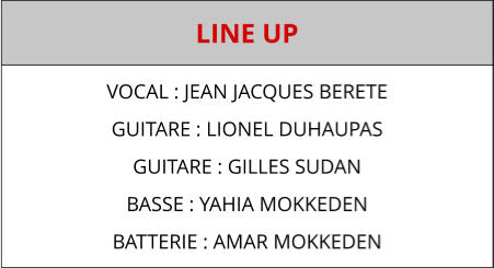 Vocal : Jean Jacques BereteGuitare : Lionel DuhaupasGuitare : Gilles SudanBasse : Yahia MokkedenBatterie : Amar Mokkeden
