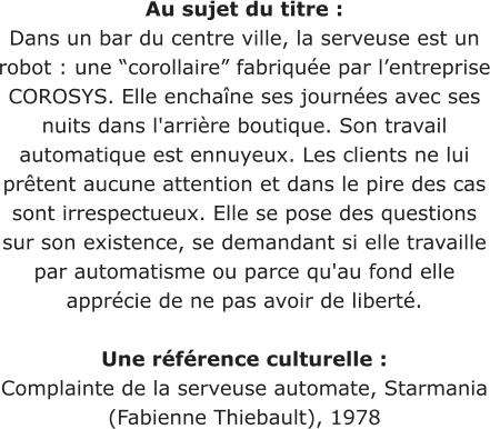 Au sujet du titre :Dansunbarducentreville,laserveuseestunrobot:une“corollaire”fabriquéeparl’entrepriseCOROSYS. Elleenchaînesesjournéesavecsesnuitsdansl'arrièreboutique.Sontravailautomatiqueestennuyeux.Les clientsneluiprêtentaucuneattentionetdanslepiredescassontirrespectueux.Elleseposedesquestions sursonexistence,sedemandantsielletravailleparautomatismeouparcequ'aufondelleappréciedenepas avoir de liberté.Une référence culturelle :Complainte de la serveuse automate, Starmania (Fabienne Thiebault), 1978