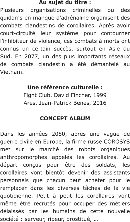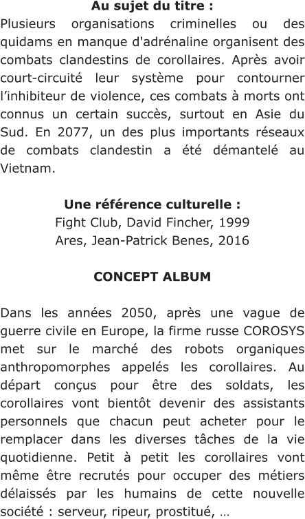 Au sujet du titre :Plusieursorganisationscriminellesoudesquidamsenmanqued'adrénalineorganisentdescombats clandestinsdecorollaires. Aprèsavoircourt-circuitéleursystèmepourcontournerl’inhibiteurdeviolence,ces combatsàmortsontconnusuncertainsuccès,surtoutenAsieduSud.En2077,undesplusimportants réseaux de combats clandestin a été démantelé au Vietnam.Une référence culturelle :Fight Club, David Fincher, 1999Ares, Jean-Patrick Benes, 2016CONCEPT ALBUMDanslesannées2050,aprèsunevaguedeguerrecivileenEurope,lafirmerusseCOROSYSmetsurle marchédesrobotsorganiquesanthropomorphesappeléslescorollaires.Audépartconçuspourêtredes soldats,lescorollairesvontbientôtdevenirdesassistantspersonnelsquechacunpeutacheterpourle remplacerdanslesdiversestâchesdelaviequotidienne.Petitàpetitlescorollairesvontmêmeêtrerecrutés pour occuper des métiers délaissés par les humains de cette nouvelle société : serveur, ripeur, prostitué, …