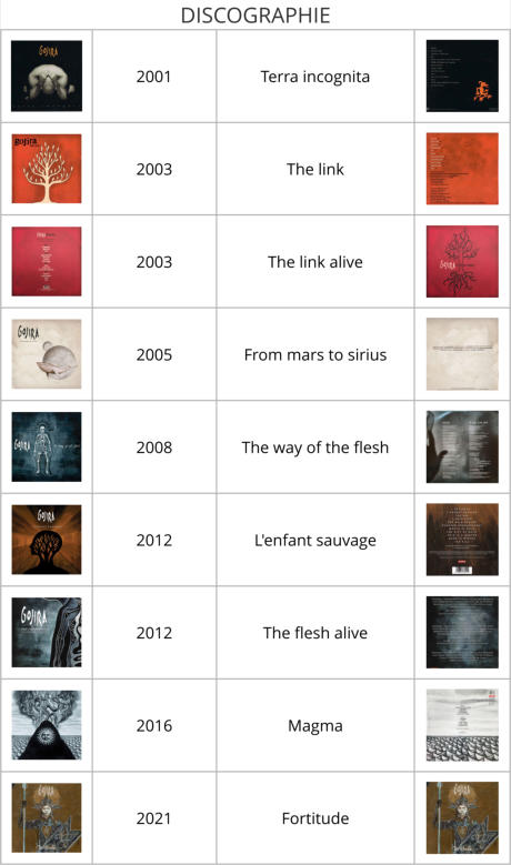 Gojira estun groupe de deathmetalfrançais,originaired'Ondres.Ilestinitialementformé en 1996 sous le nom de Godzilla, puis adopte le nom de Gojira en 2001.Associéau deathmetal,au metalprogressif,Gojirasedistinguedanslascènemetalparla sensibilitéécologisteetspirituelledeleurschansons.Enoutre,tousleurstextessontécritsen anglais.AyantconnulesuccèsparmilesamateursenFrancedèslasortiedeleurpremier albumen2001,legroupeconnaîttrèsrapidementlacélébritéaux États-Unis,puisdansle mondeentier,cequilesconduitdanslesplusgrandsfestivals,telsquele WackenOpenAir et le Hellfest etàjoueravecdesgrandsgroupescomme,IronMaiden(LegacyoftheBeastTour 2018) Metallica, Slayer, ChildrenofBodom,ouencore LambofGod.Gojiraareçuen2017 unedoublenominationaux GrammyAwards pourlemeilleuralbumrocketmeilleure performancemetaldel'annéeavec Magma.Le 5août2020,Gojirasortunsingleintitulé: Another World et le 30 avril 2021 le groupe sort son album Fortitude.