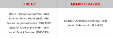Basse : Philippe Garcia (1982-1986)Batterie : Gérard Michel (1982-1986)Guitare : Armando Ferreira (1982-1986)Guitare : Paul Ferreira (1984-1986)Vocal : Patrick Diamond (1985-1986)