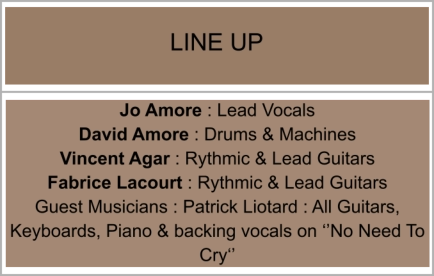 Jo Amore : Lead VocalsDavid Amore : Drums & MachinesVincent Agar : Rythmic & Lead GuitarsFabrice Lacourt : Rythmic & Lead GuitarsGuest Musicians : Patrick Liotard : All Guitars, Keyboards, Piano & backing vocals on ‘’No Need To Cry‘’