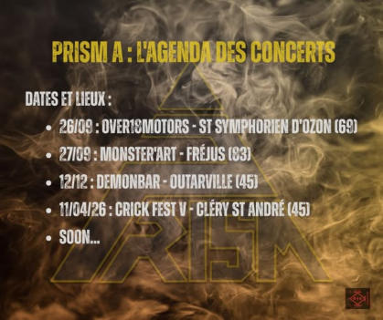 Créeen2018,àl’initiativedeChris(guitare,choeurs)etFred(Basse),tousdeuxex-membresdutributeband«THEIRON TROOPERS»,PRISMestungroupede5musiciensissusdelascènerégionale(CENTRE),tousmotivésparlaforte volonté de composer et jouer des titres énergiques et mélodiques, aux influences Hard US FM des années 80°s.Un festival leur permet de se produire sur la même scène que Chris Slade et Cock Robin.Fin2019,aprèsledépartdeplusieursmembres,FredetChris,encoreplusmotivés,recrutentrapidementBen(batterie, choeurs), Gil (Claviers) et Phil (Chant) (ex.Muren, ex.Chrome) et renomment le groupe en PRISM A.Depuis,unminiEP4TitresnomméADN,produitetdistribuéparCRICKFORZIK,disponiblesurdenombreuses plateformesdigitalesréputées,sortfin2020,puismi-2021,unpremierclippromotionneldeROCKNOWestdiffusésurleur chaine Youtube.Aprèsplusieursmoisàcréerdenouveauxtitres,ainsiqu’unbonnombredeconcerts,legroupes’enfermeenstudiopour donner naissance au LP de 9 titres, « WAY OF LIFE », sortie officielle prévue fin 2023.PRISM A fait parti également du catalogue du label FTF MUSIC.2025:C'estmaintenantofficiel!!!Voicilanouvelleteamavecl'arrivéedenotrenouveauclavieriste:Yo!!!....etenplus choriste!!!De nombreux concerts pour présenter leur univers sont déjà prévus … stay tuned