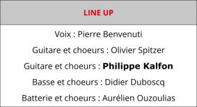 Vocal : Pierre BenvenutiGuitare : Olivier SpitzerGuitare : Philippe KalfonBasse : Noël Assolo Batterie : Gerald Manceau