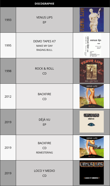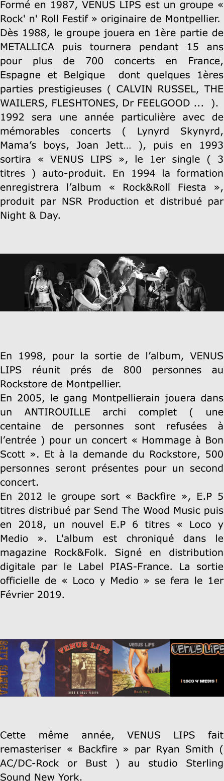 Forméen1987,VENUSLIPSestungroupe«Rock'n'RollFestif»originairede Montpellier. Dès1988,legroupejoueraen1èrepartiedeMETALLICApuistournerapendant15ans pourplusde700concertsenFrance,EspagneetBelgiquedontquelques1èresparties prestigieuses ( CALVIN RUSSEL, THE WAILERS, FLESHTONES, Dr FEELGOOD ... ).1992serauneannéeparticulièreavecdemémorablesconcerts(LynyrdSkynyrd, Mama’sboys,JoanJett…),puisen1993sortira«VENUSLIPS»,le1ersingle(3titres) auto-produit.En1994laformationenregistreral’album«Rock&RollFiesta»,produitpar NSR Production et distribué par Night & Day.En1998,pourlasortiedel’album,VENUSLIPSréunitprésde800personnesau Rockstore de Montpellier.En2005,legangMontpellierainjoueradansunANTIROUILLEarchicomplet(une centainedepersonnessontrefuséesàl’entrée)pourunconcert«HommageàBon Scott».EtàlademandeduRockstore,500personnesserontprésentespourunsecond concert.En2012legroupesort«Backfire»,E.P5titresdistribuéparSendTheWoodMusicpuis en2018,unnouvelE.P6titres«LocoyMedio».L'albumestchroniquédansle magazineRock&Folk.SignéendistributiondigitaleparleLabelPIAS-France.Lasortie officielle de « Loco y Medio » se fera le 1er Février 2019.Cettemêmeannée,VENUSLIPSfaitremasteriser«Backfire»parRyanSmith(AC/DC-Rock or Bust ) au studio Sterling Sound New York.